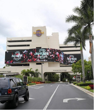 A large, digital screen welcomes guests to the Seminole Hard Rock Hotel & Casino near Hollywood. The hotel is one outpost of a global brand with 22 hotels and one racino, and entities in 68 countries between its hotels, cafes, casinos and concert venues. Emily Michot emichot@miamiherald.com